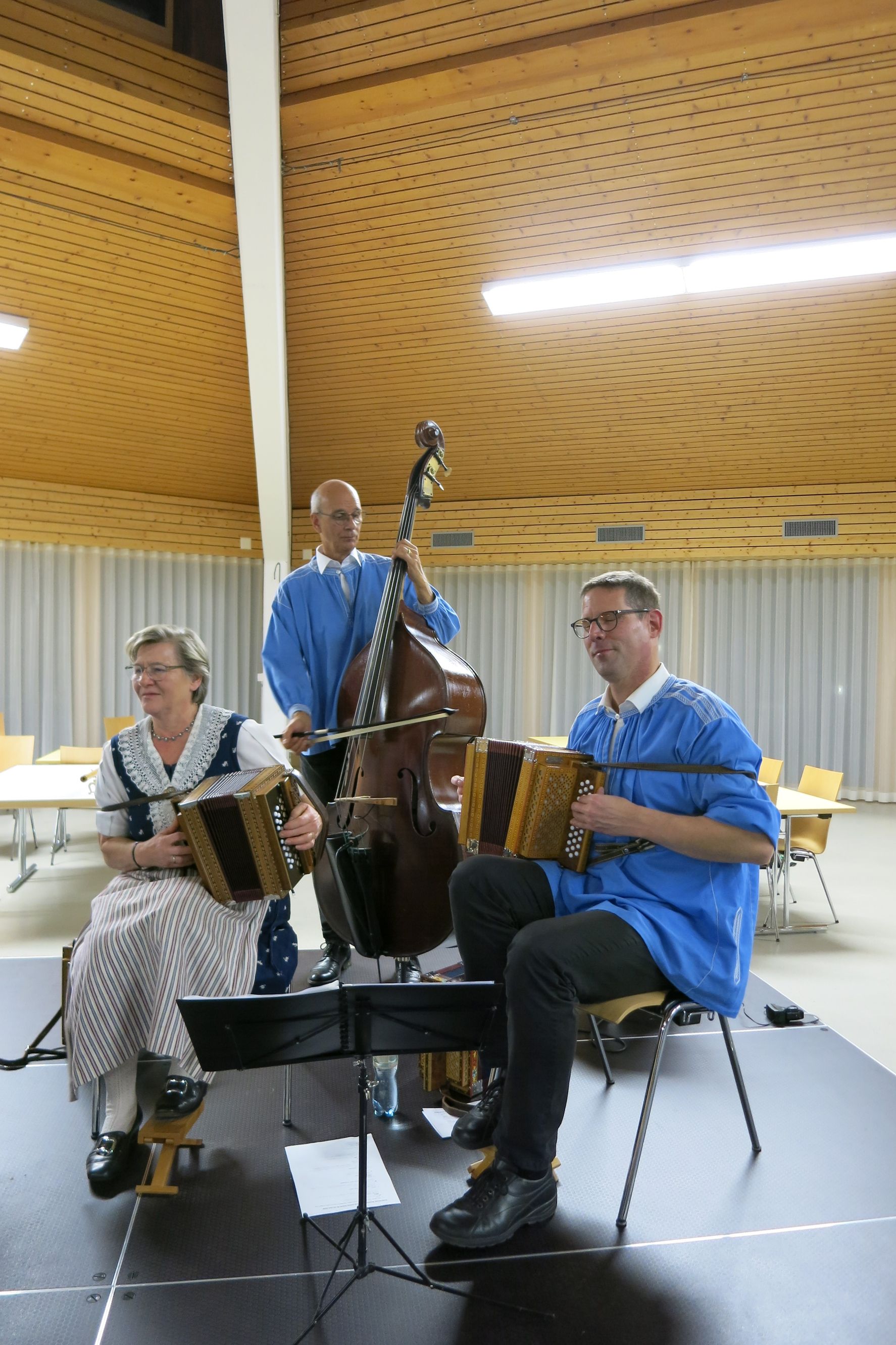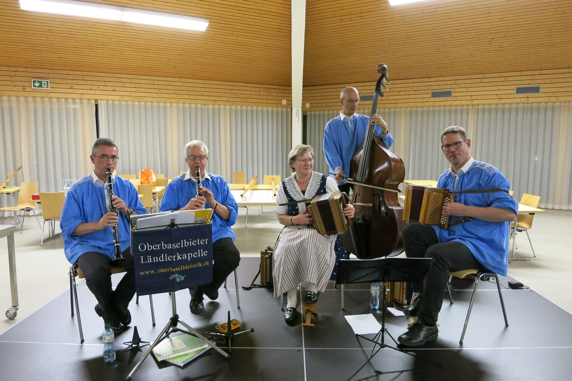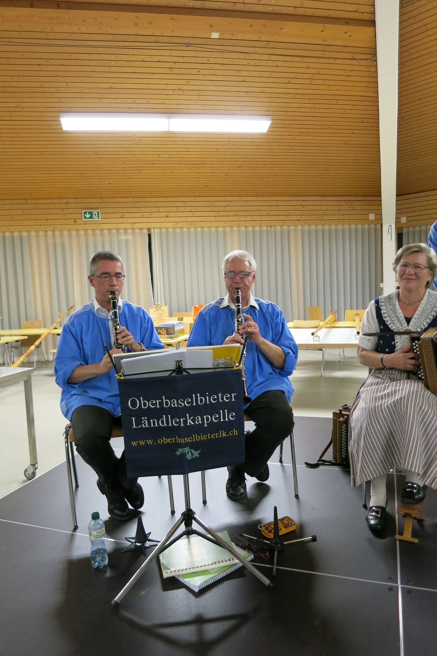 Die OLK macht sich für den Einsatz in der vollbesetzten Mehrzweckhalle bereit. Am Start fehlt Vreni, die üblicherweise für Fotos besorgt ist. Auf dem Bild fehlt auch der zweite Klarinettist, der sich eben als Fotograf auszeichnen möchte ...
