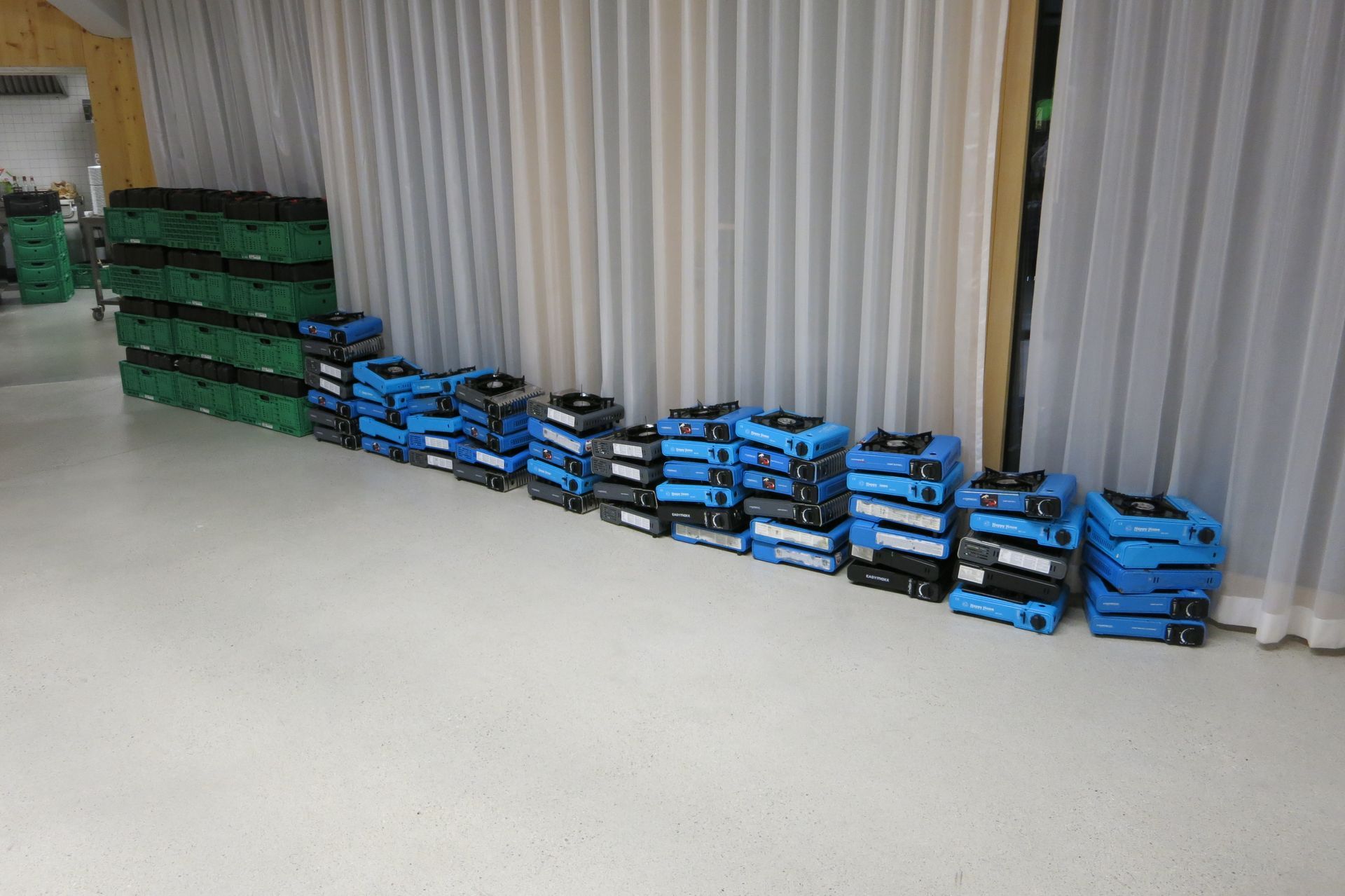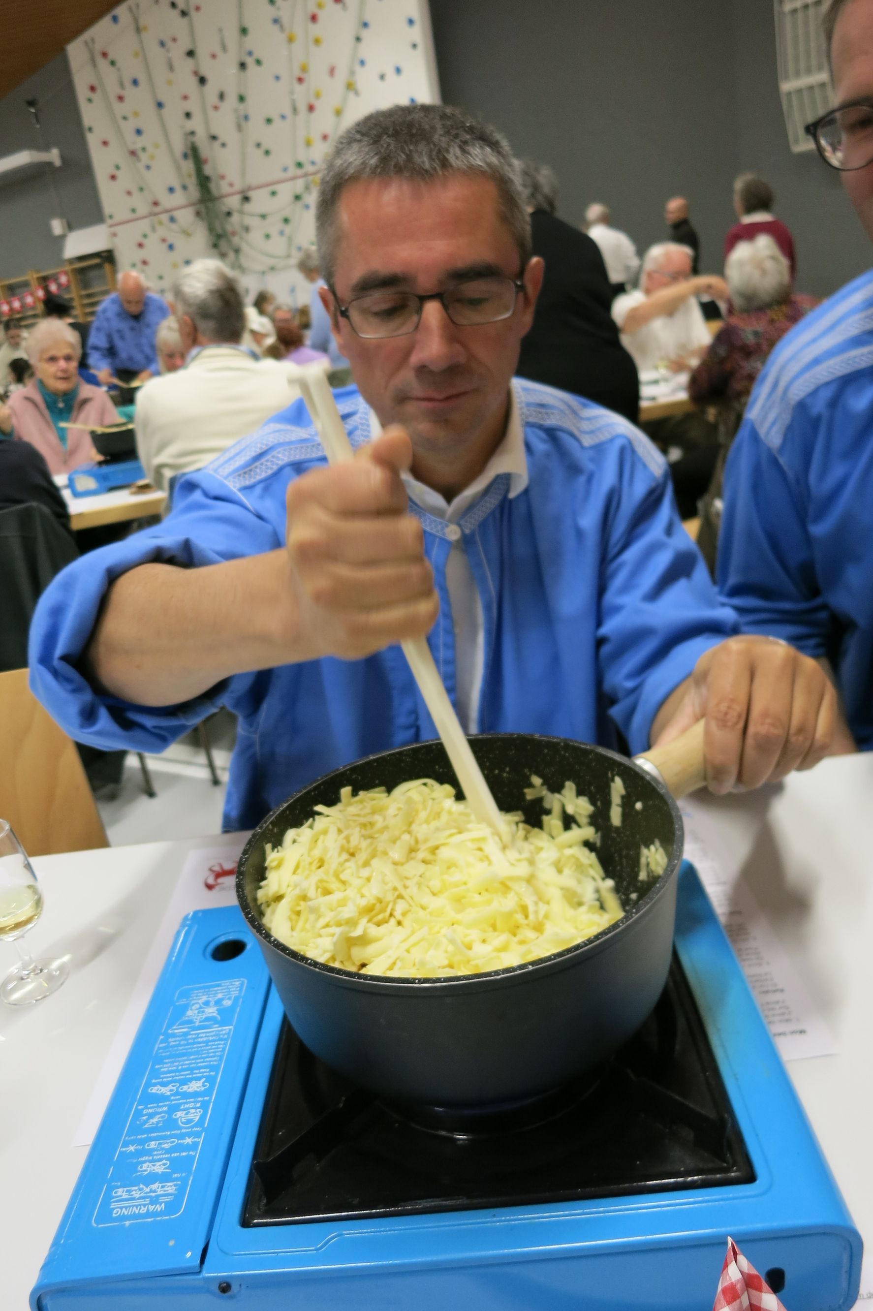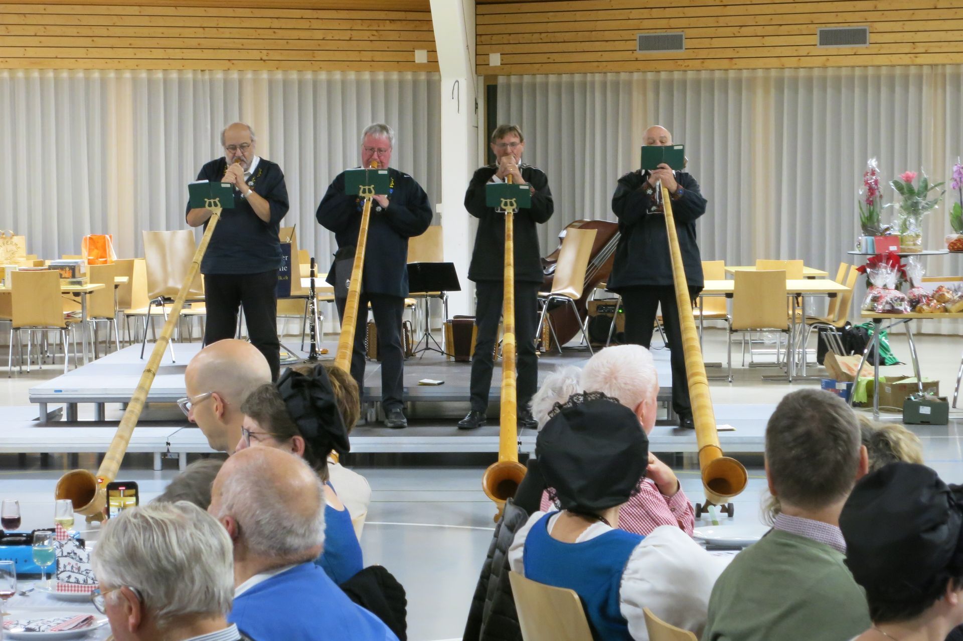 Die OLK macht sich für den Einsatz in der vollbesetzten Mehrzweckhalle bereit. Am Start fehlt Vreni, die üblicherweise für Fotos besorgt ist. Auf dem Bild fehlt auch der zweite Klarinettist, der sich eben als Fotograf auszeichnen möchte ...
